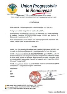 Christhelle Houndonougbo n’aurait ni reçu de pouvoir spécial ni informé le président du parti avant de prendre cette initiative. Lire le communiqué.
