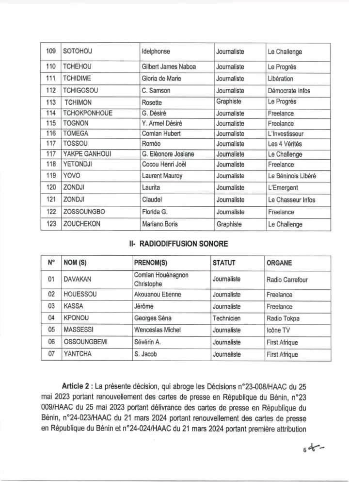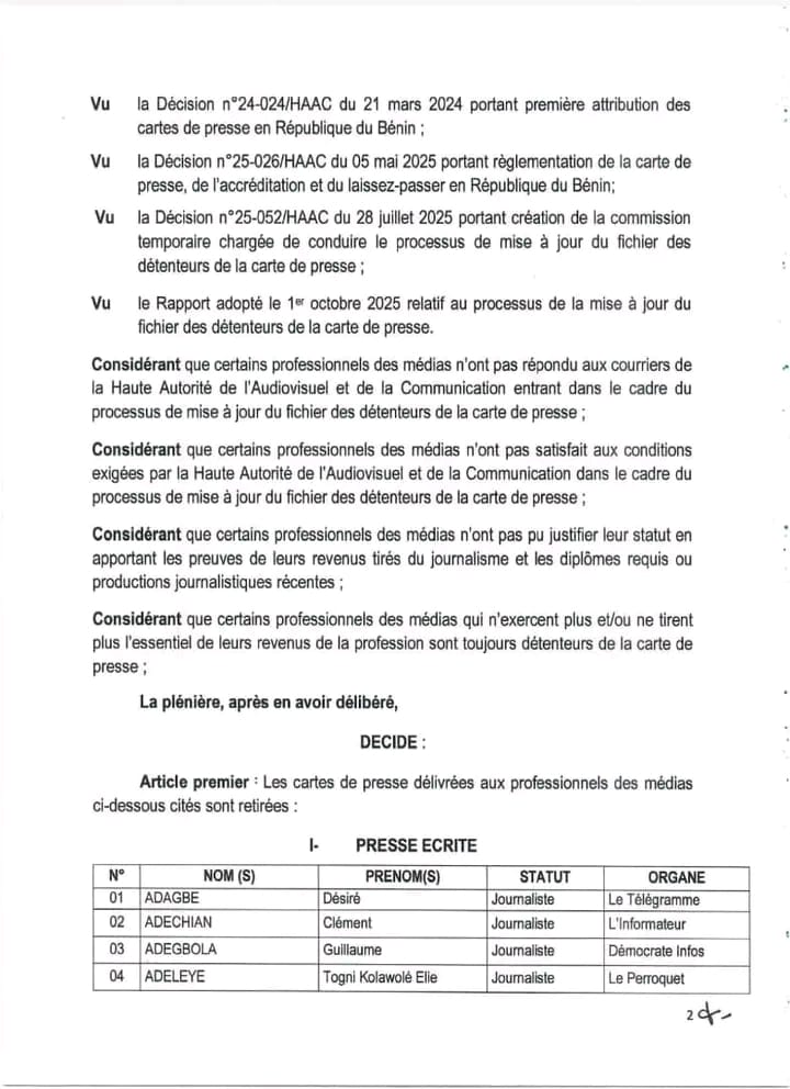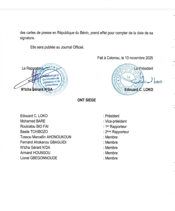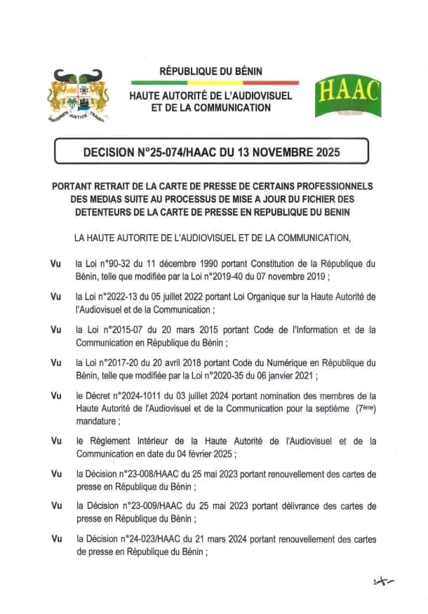 Selon la décision n°25-074/HAAC du 13 novembre 2025, plusieurs journalistes, graphistes et techniciens de la presse écrite et de la radiodiffusion sonore n’ont pas répondu aux convocations de la HAAC, n’ont pas présenté les preuves de leurs revenus issus du journalisme ou ne remplissaient plus les conditions requises pour conserver leur carte.