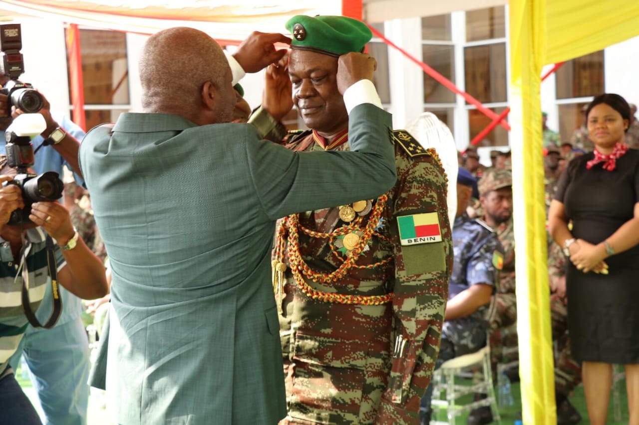 La cérémonie solennelle de remise des attributs de grades s’est déroulée en présence de hautes autorités civiles et militaires. Le Ministre de la Défense nationale, Alain Fortunet NOUATIN, a transmis les félicitations du Chef suprême des armées, saluant l’engagement, la loyauté et le sens du devoir des deux officiers.